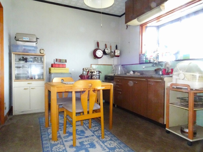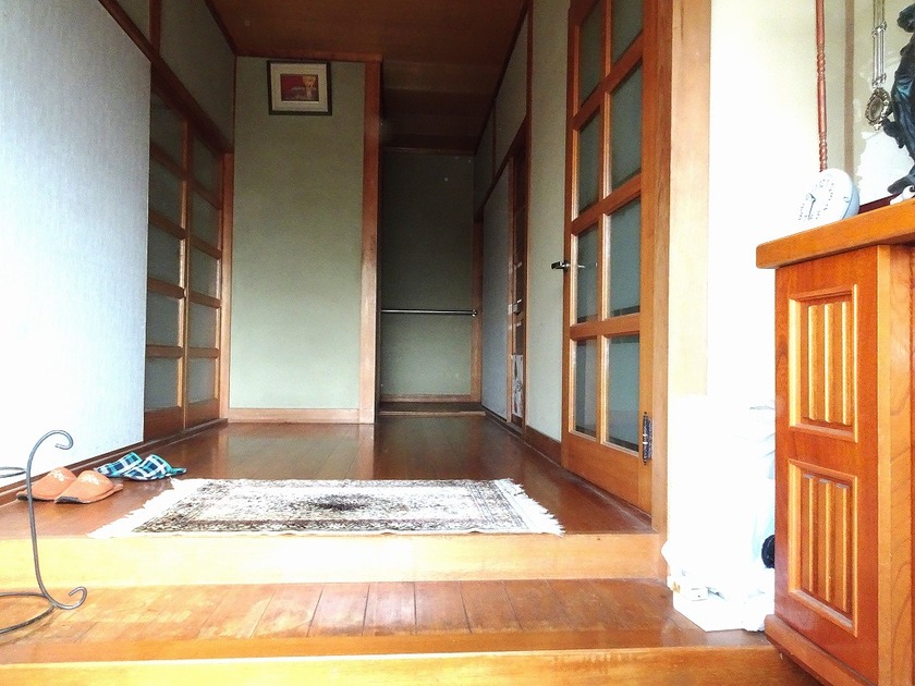 次は本題の農機具倉庫より西庭に出て2階建て住居の玄関を開けると広い玄関内を台所まで一直線のローカが目に入り、台所は少し使用感がある木製のキッチンが設置してあり、広さも問題ない約7帖の広さを確保しております♪